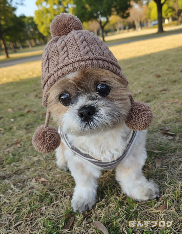 ポンポン付きのニット帽子をかぶせた、かぼす。