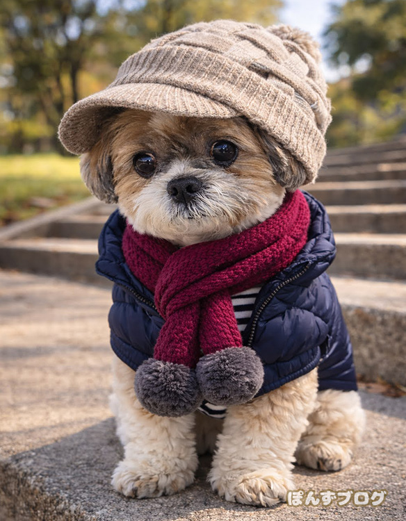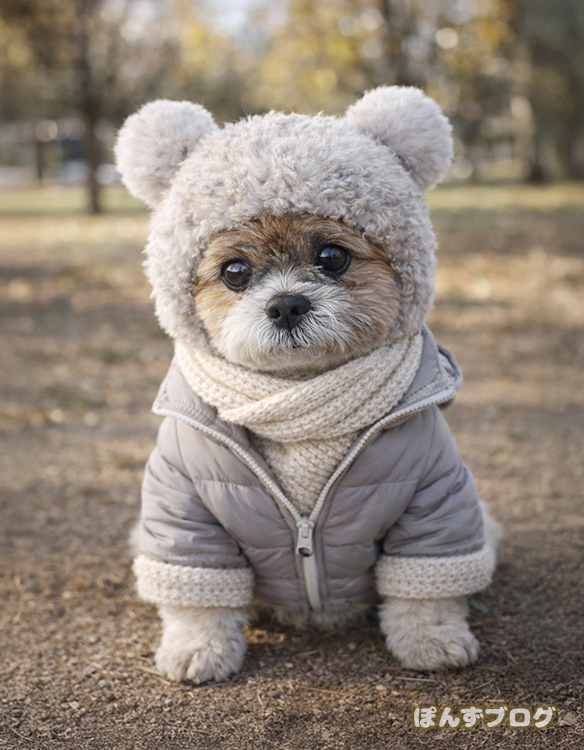 耳付きモコモコニット帽子、ニットマフラー、ダウンジャケット