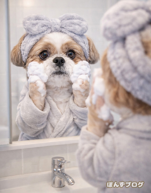 夜な夜な鏡の前で日々のセルフケアを欠かさない、ぽんず母さん。
