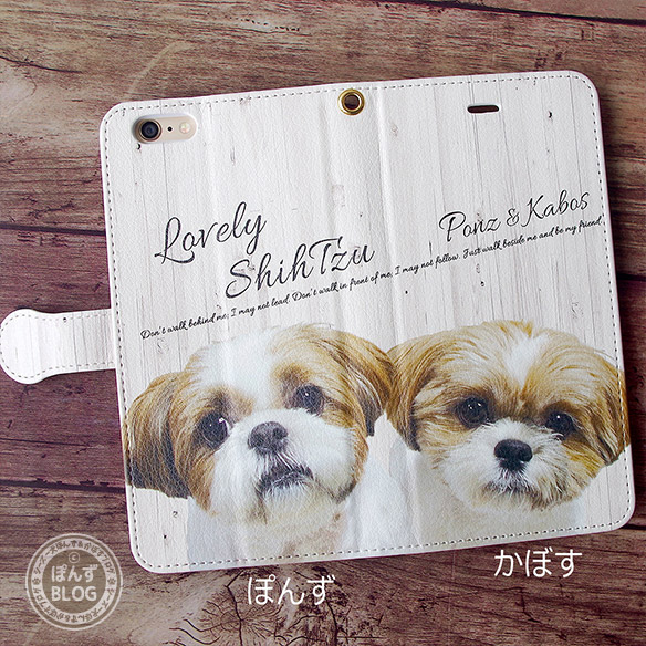 ⇒手帳型スマホカバー シーズー犬ぽんず&かぼす 木目調