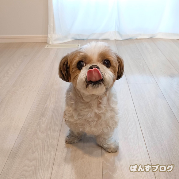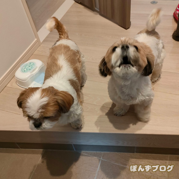 嬉しそうに玄関でしっぽを振る、ぽんずとかぼす。