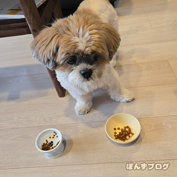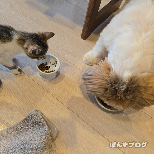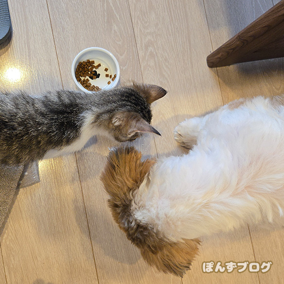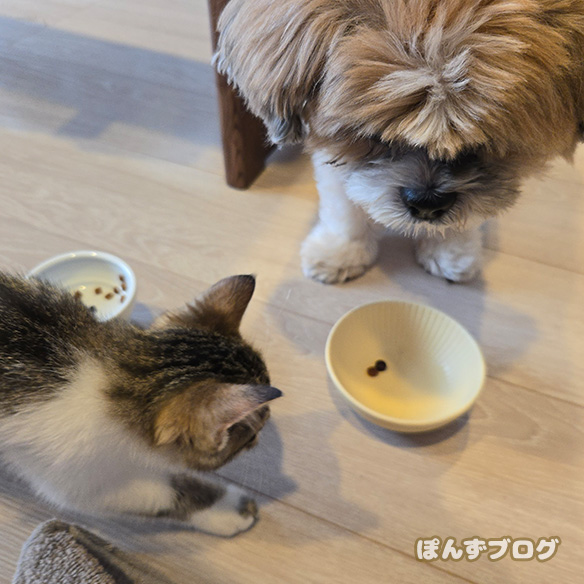 自分のフードよりかぼすのフードの方を気にしてしまいます。