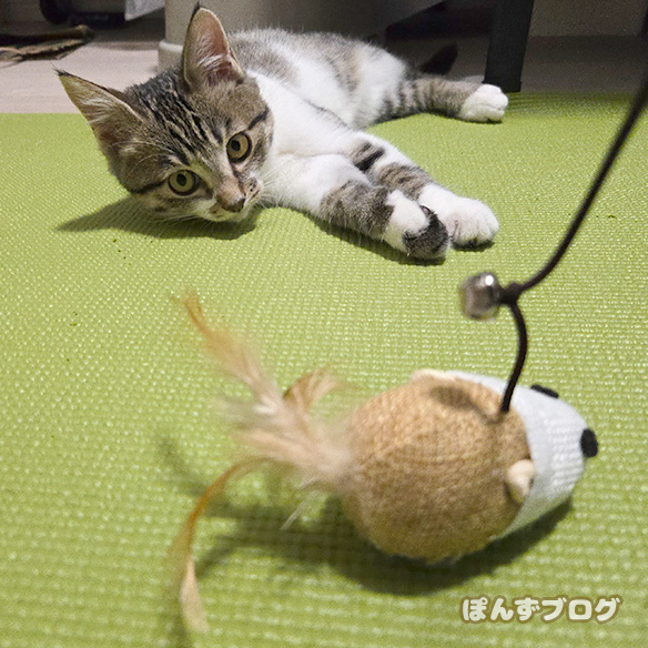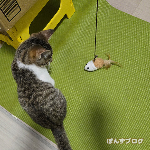 こうした猫じゃらし系のおもちゃを目の前に吊るしてぷらぷらしてるだけで・・・