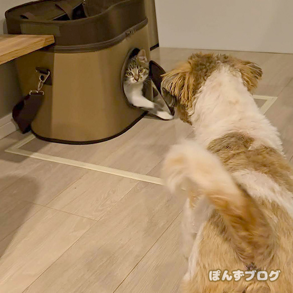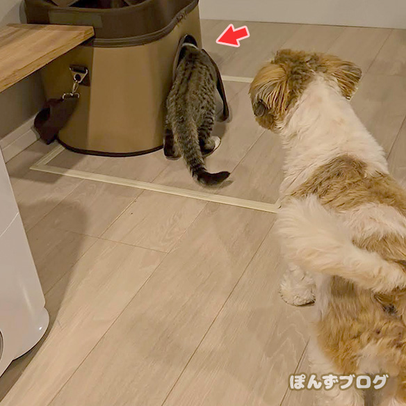 このキャリーバッグの中にわざと入りこんで、かぼすを誘い・・・