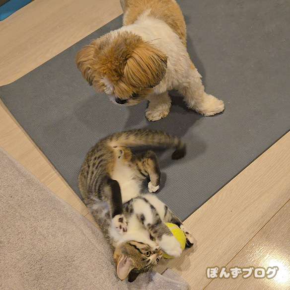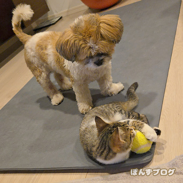 テニスボールを転がして遊ぶはっさくと