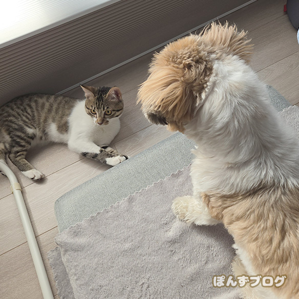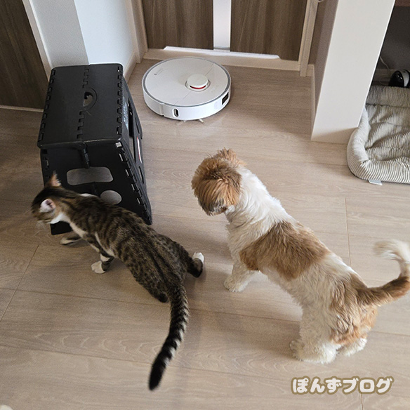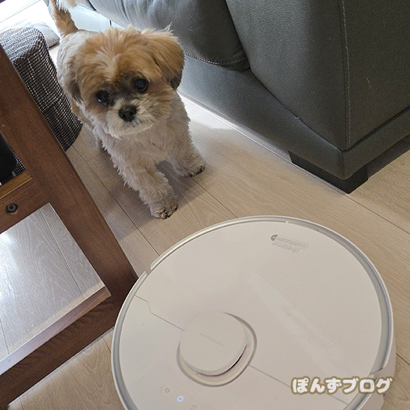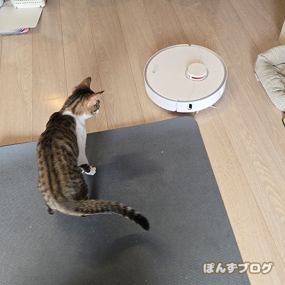 怪しく動き回るロボット掃除機が気になってきた様子。