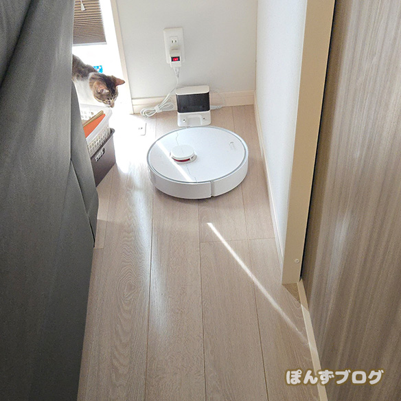 さっきまでロボット掃除機のあった場所がなぜか気になるらしく