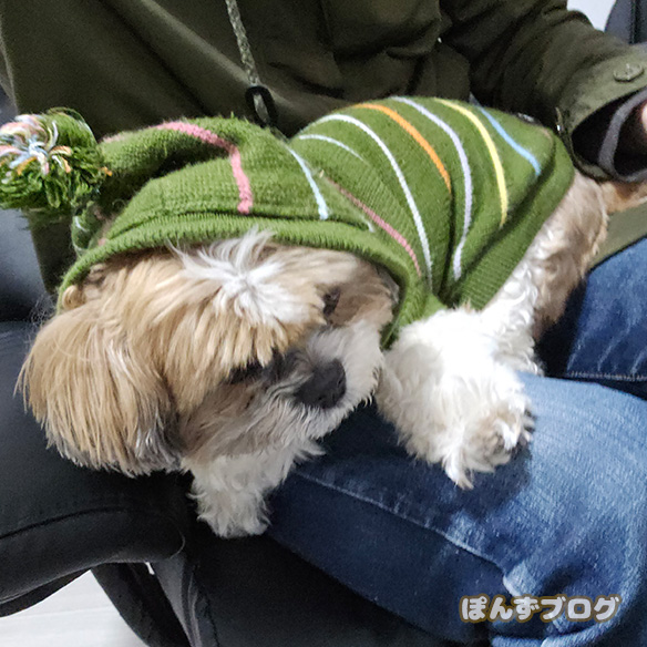 一番寒がりのかぼすは服を着て、飼い主の上であったまっていました。