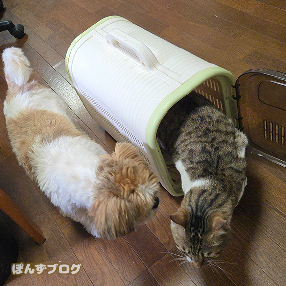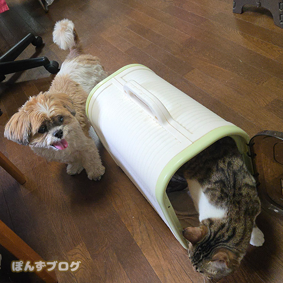 くつろいでいたぽんずの近くにはっさくハウスを置いてみましたが・・・