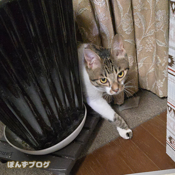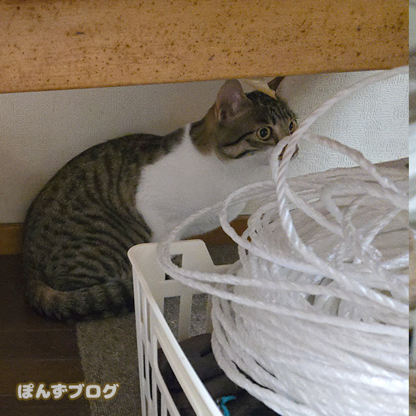 速攻で机の下に逃げ込むように隠れてしまいました。