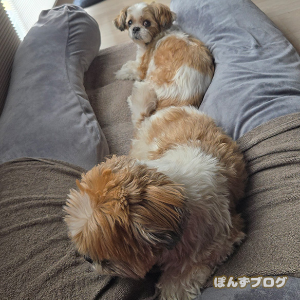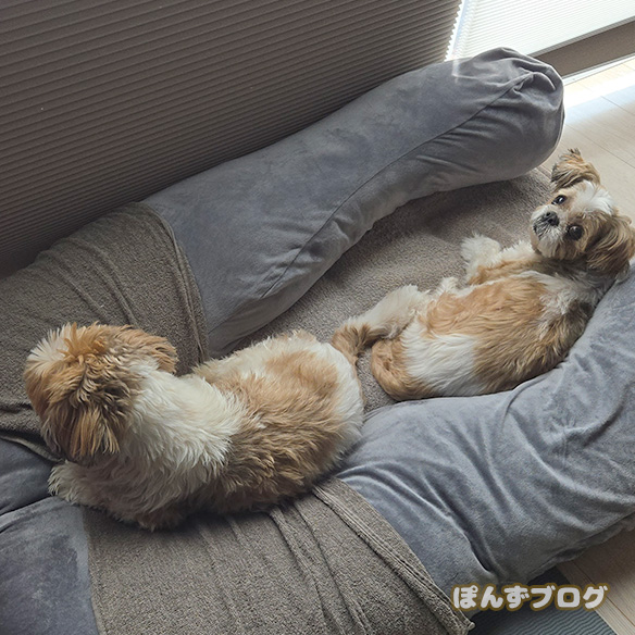 このでっかい抱き枕、構造的に犬は落ち着くのかもしれませんね。