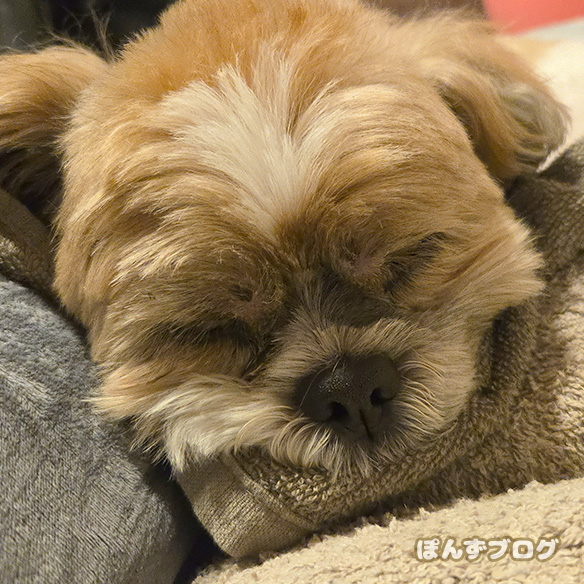 しぶしぶながら散歩に連れていかれる、ぽんかぼ。