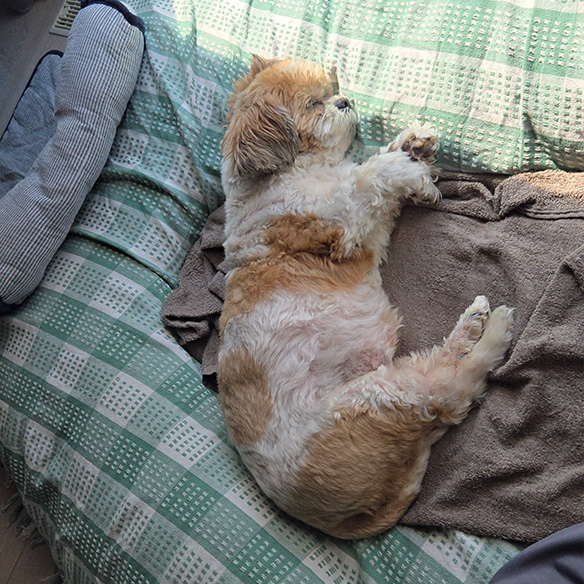 5月に入り、いよいよ暑くなってきましたね。 ぽんずもベッドからはみ出して、『こてん』寝しています。 それにしても、ぽんずの『こてん』寝姿は 穏やか...