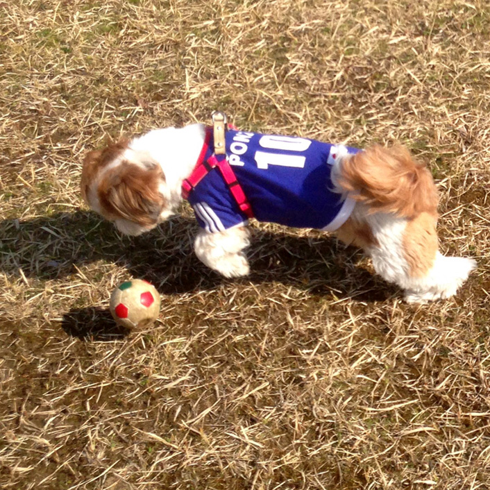 今日の関東地方はポカポカ陽気でした。 こんな日はぽんず店長、犬用サッカーユニフォームを着こんでトレーニングです。