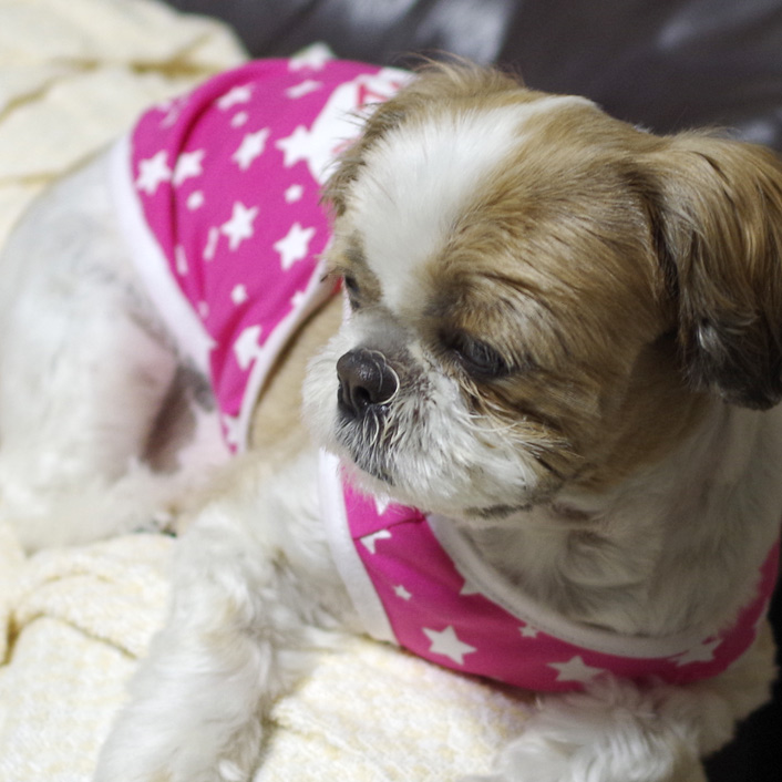 写真は、玄関先でお散歩待ちするシーズー犬ぽんず。 散歩するときにいつも付けている胴輪。 この茶色の色合いがとってもぽんずの毛色と合っていたので 大変(飼い主が)気にっ...