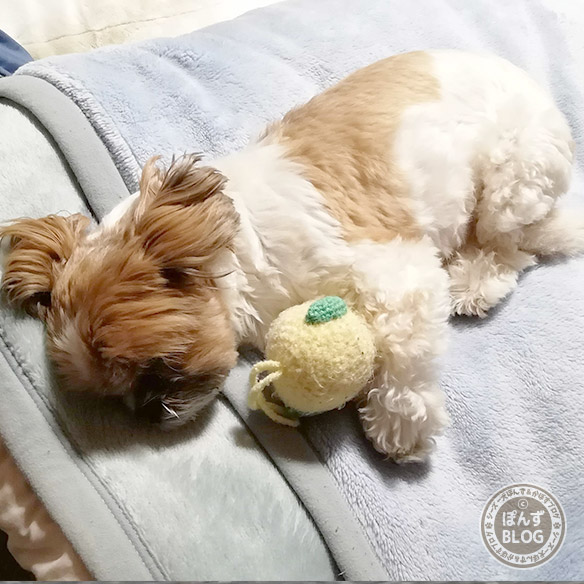 お気に入りのおもちゃで 遊びながら寝ている、かぼす。 今日は散歩行けなかったのですが、 何かと家でも遊べるのが、かぼすです。