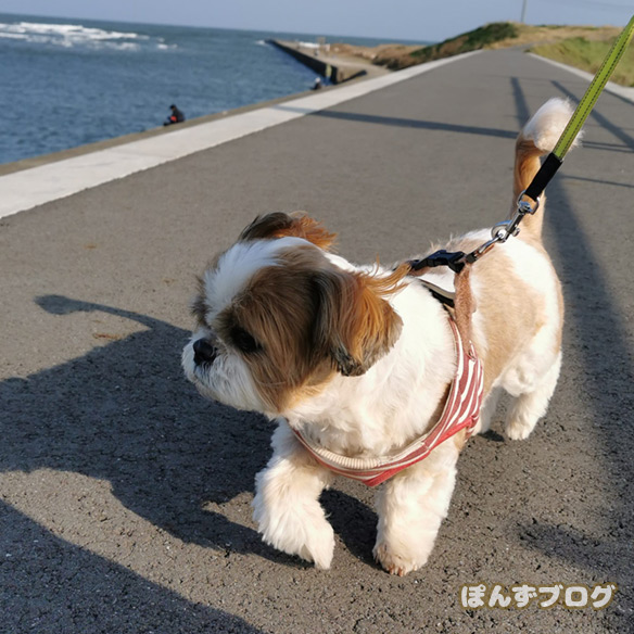 ぽんかぽちゃん海大好きで散歩嬉しそう❗海景色眺めながら気分良いよね近くに住めるとぽんずママストライキしないかぼ