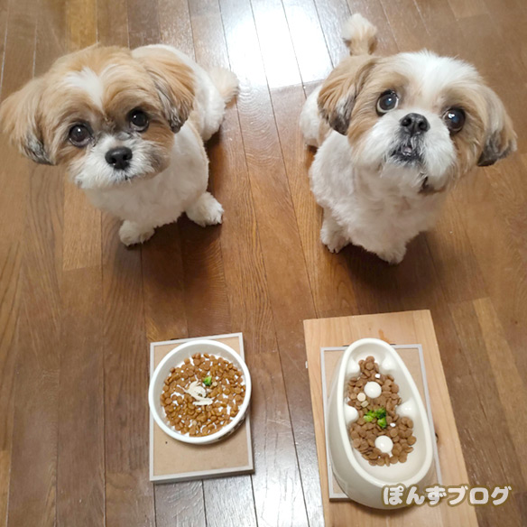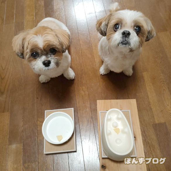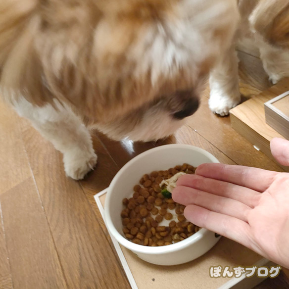 飼い主の「よし」を聞いても、なかなか食べ始めません。