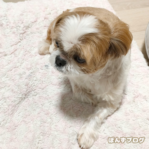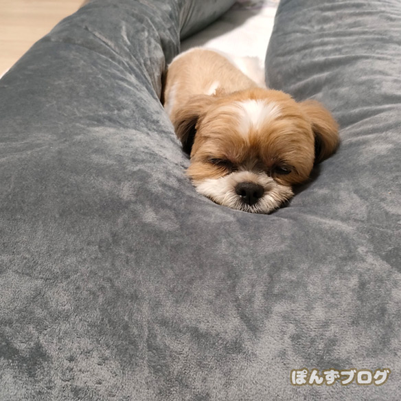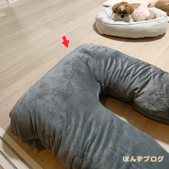 大きい枕に挟まれる事で犬的に落ち着くのかもしれません。