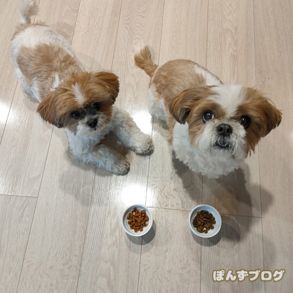 ぽんず達にドッグフードをあげるのにしゃがんで、