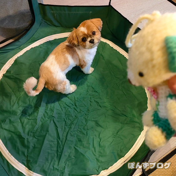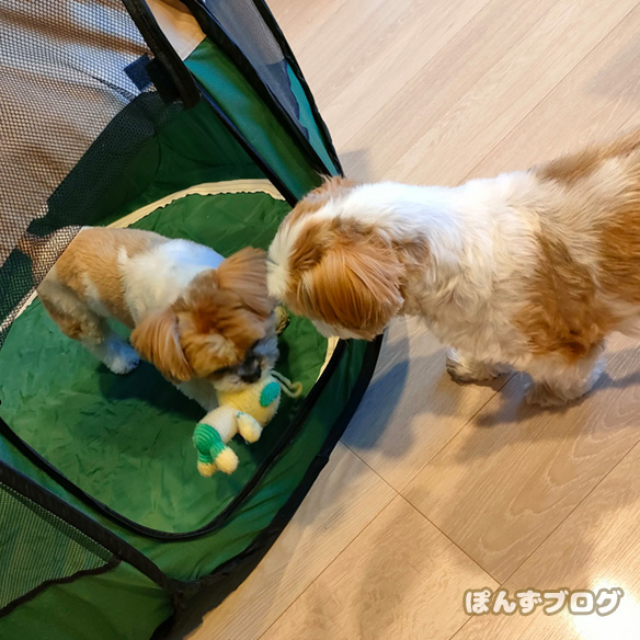 おもちゃを使ってかぼすをこの中で遊ばせようとしますが・・・