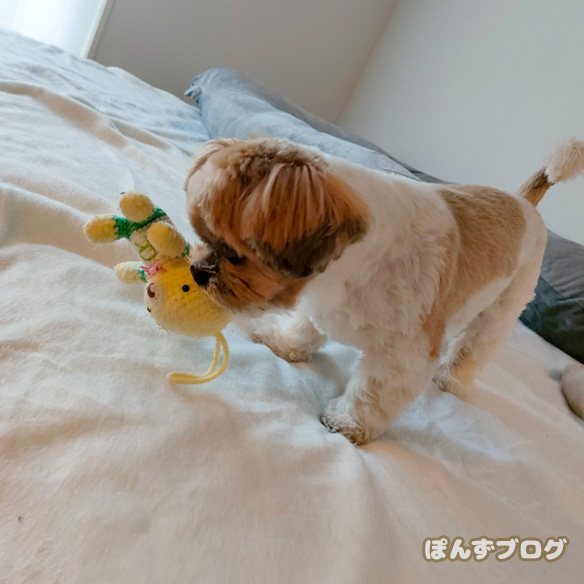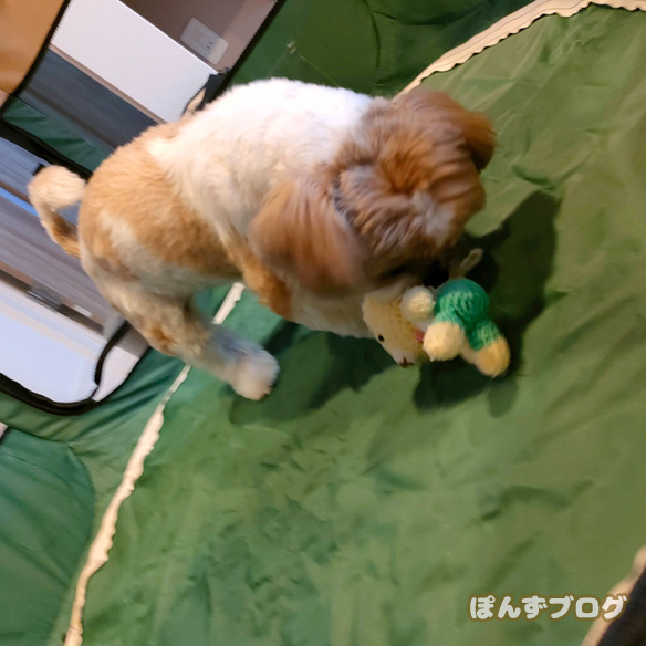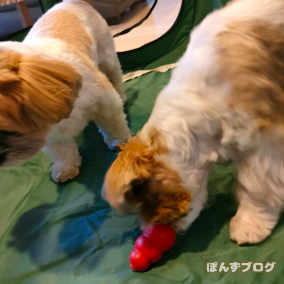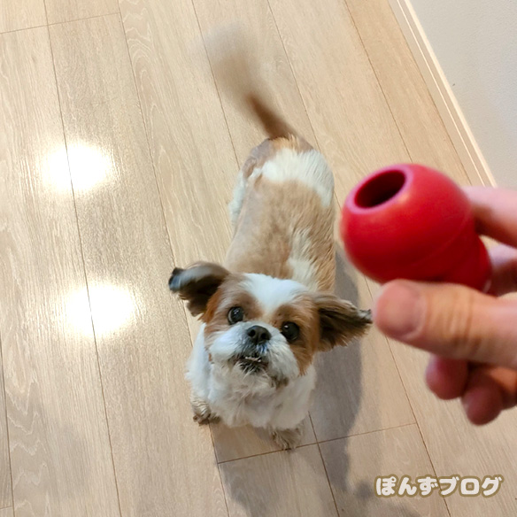 ぽんずが何度もコングを転がして時間をかけて食べる事で運動になる、