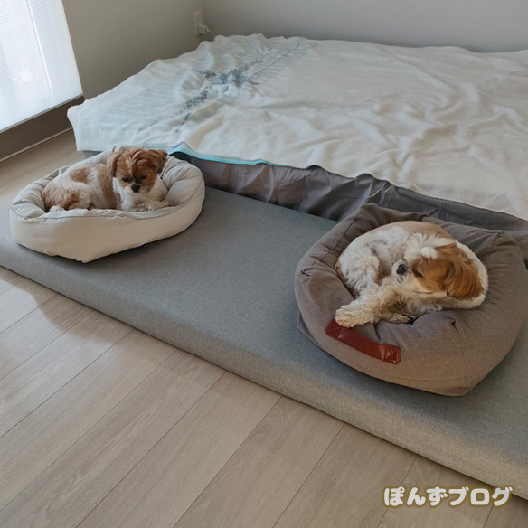 自分たちの寝床でくつろいでいる、ぽんずとかぼす。