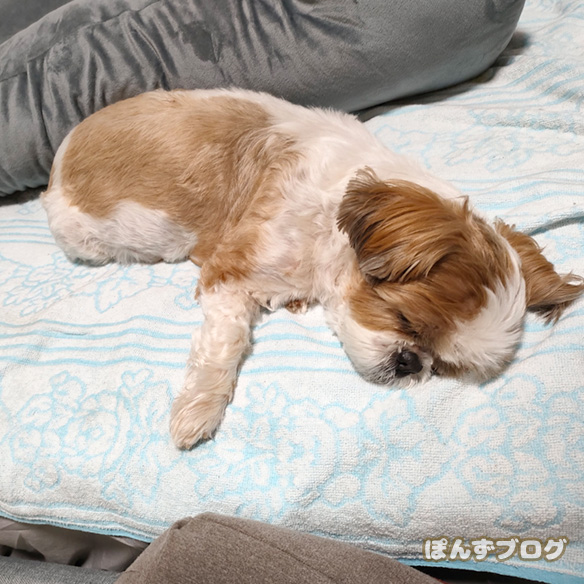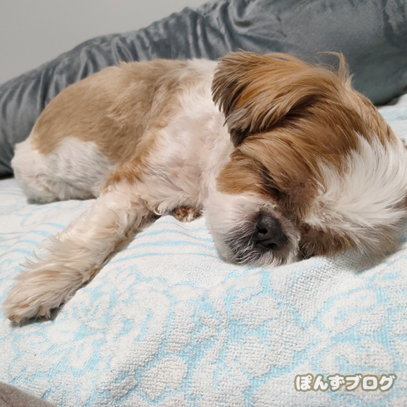 ベッドの上でくつろぐぽんず。 今日は気温は高いですが、風があって窓を開けるとぽんずも気持ちよさそうです そのまま、寝てしまいました・・・。