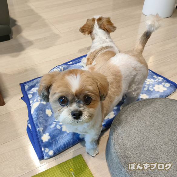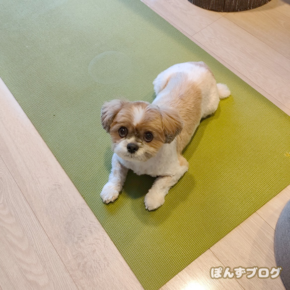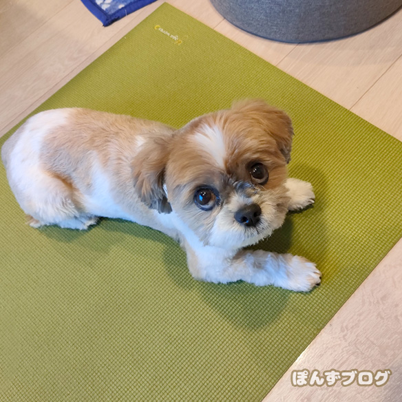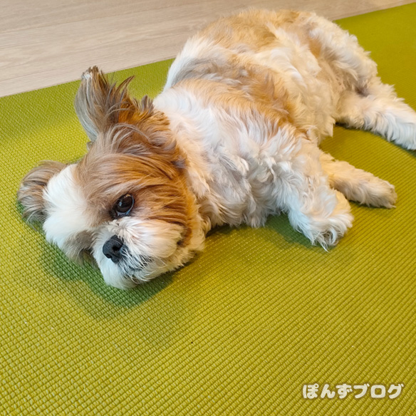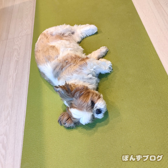 今日もヨガマットの上でぐて寝している、ぽんず。