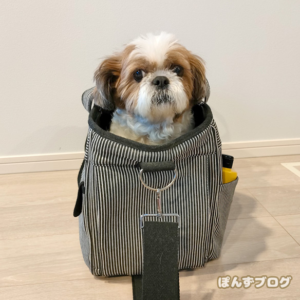 というわけで急に起こされてバッグに入れられたぽんずですが、