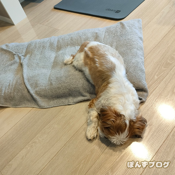 ぐてぇ~っと寝床からはみ出して寝る事が多いぽんずに対し、