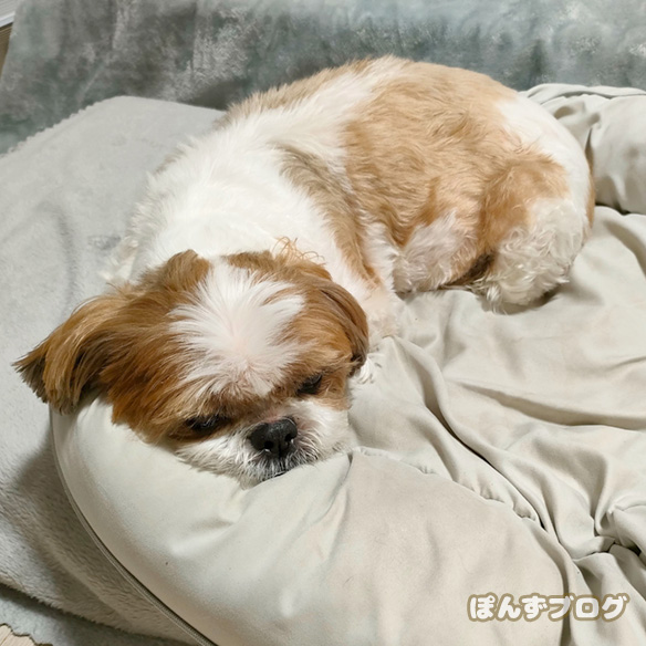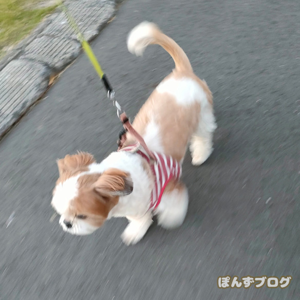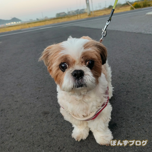 明るいうちに散歩に行けて、良かったねぽんず。