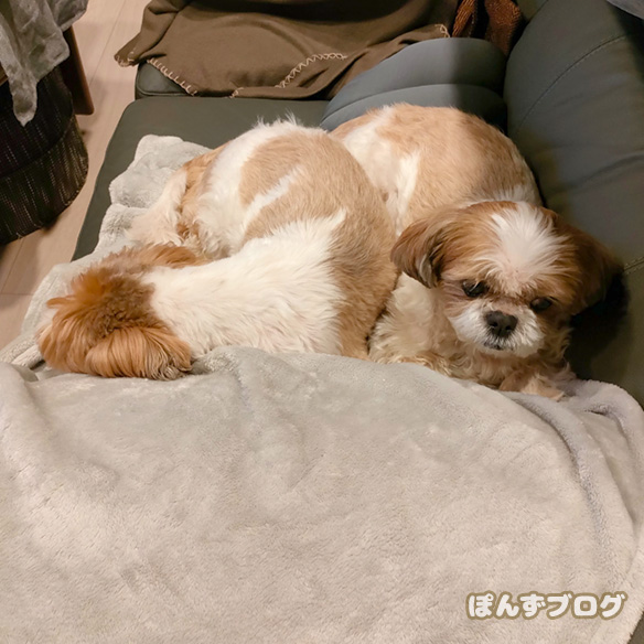 椅子の上で仲良くくっついている、ぽんずとかぼす。
