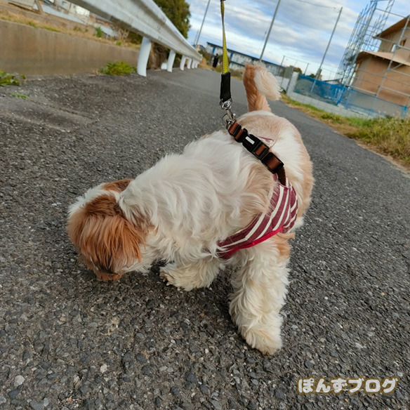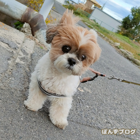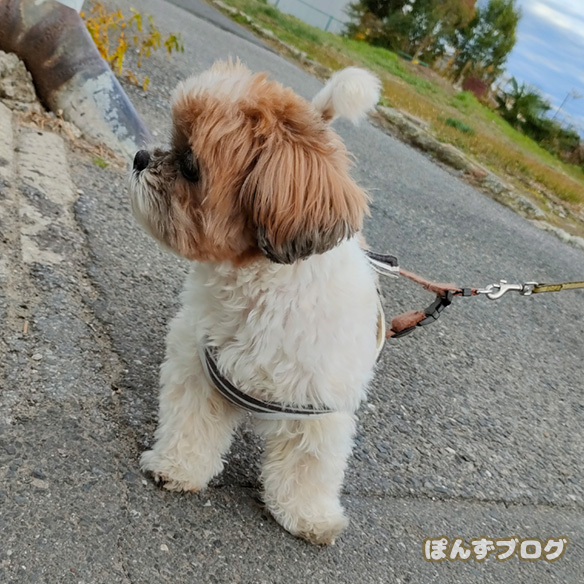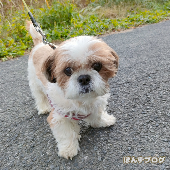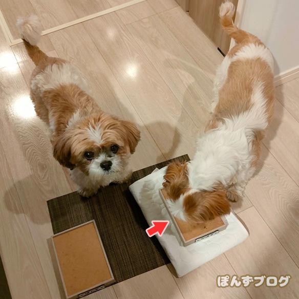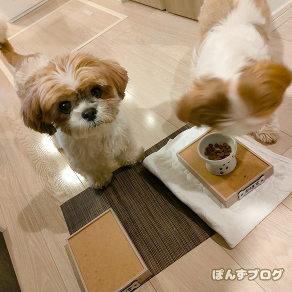 ぽんずだけ先に食べさせても、吠えないでじっと待っている、かぼす。