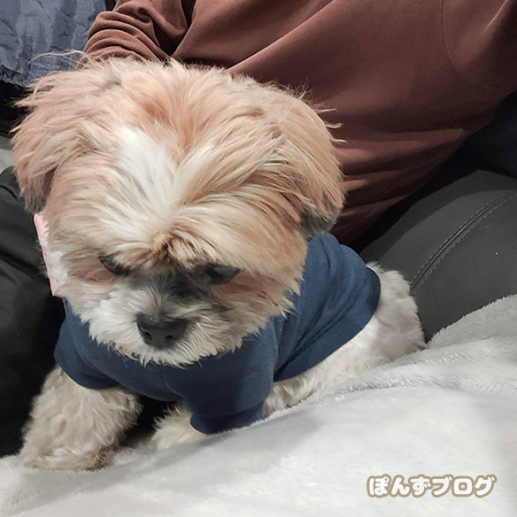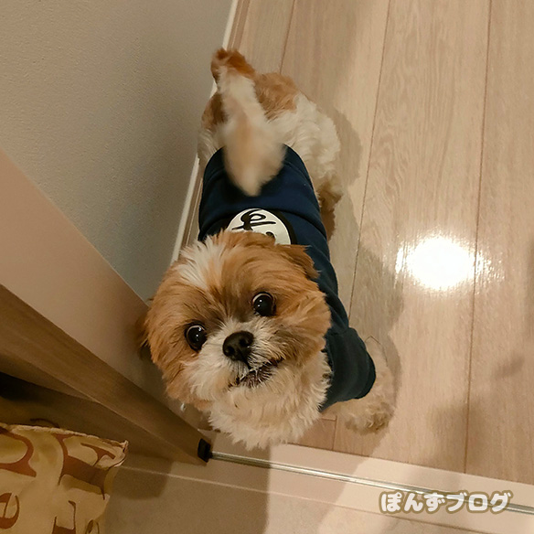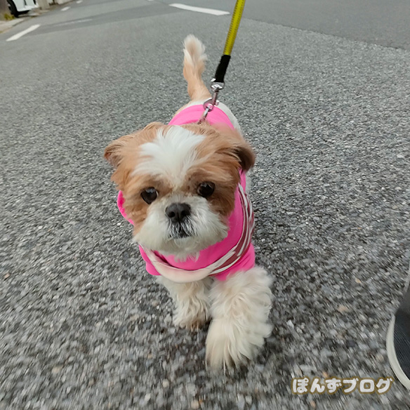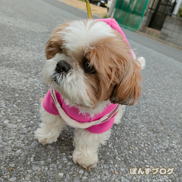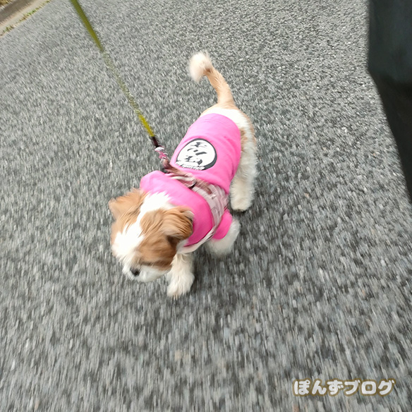 再び服を着て散歩のぽんず。