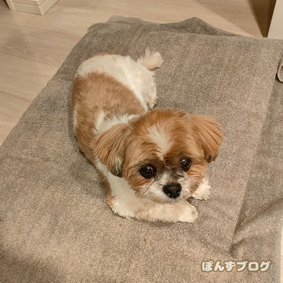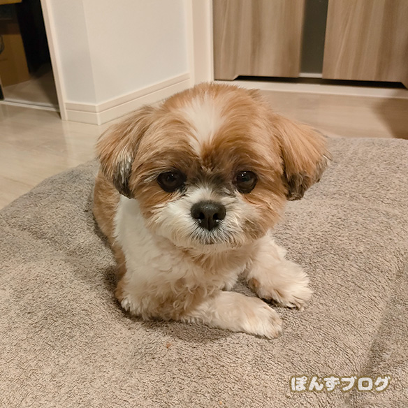 家では、すでに散歩を終えたかぼすがくつろいでいました。