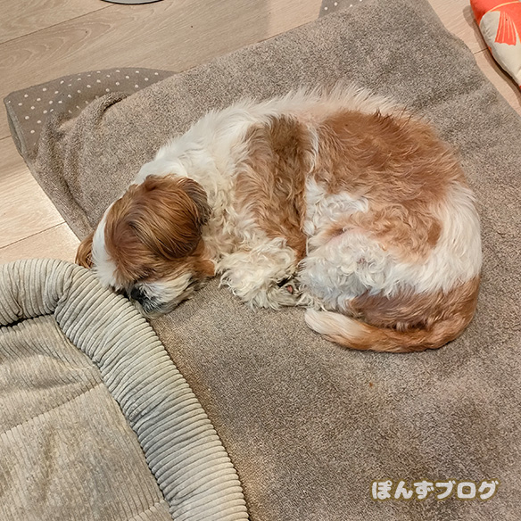 頭からしっぽの先まで丸くなって寝ている、ぽんず。