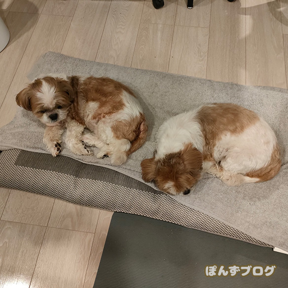 帰ってくると、かぼすの横に寝るぽんず。