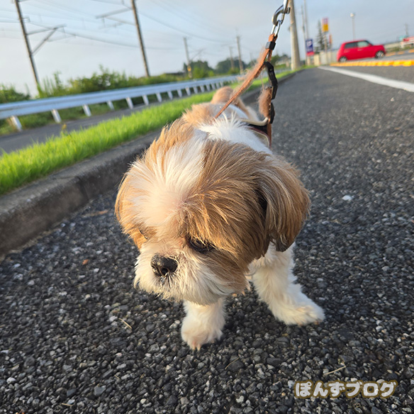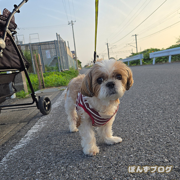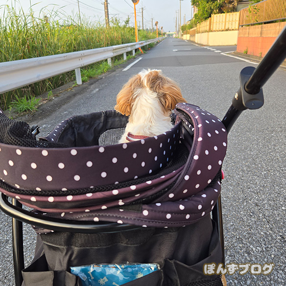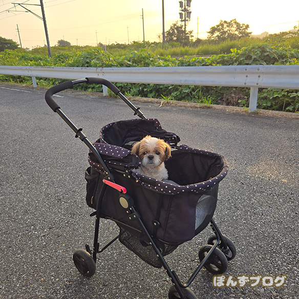 すでに暑かったので、カートにぽんずを乗せて散歩しました。