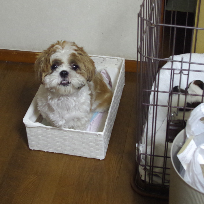 ぽんずの出産から19日目。 チビたちが寝ているサークルの横には、四角い箱。 これはチビたちをサークルから移動するときに、一時的に入れておくための箱なのですが・・・。