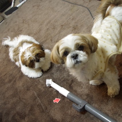 スイッチを入れ、掃除機の大きな音がなると、2匹とも臨戦態勢。 ぽんずは「わん!わん!わん!」と吠えまくり、かぼすも最初は同じように吠えていましたが・・・