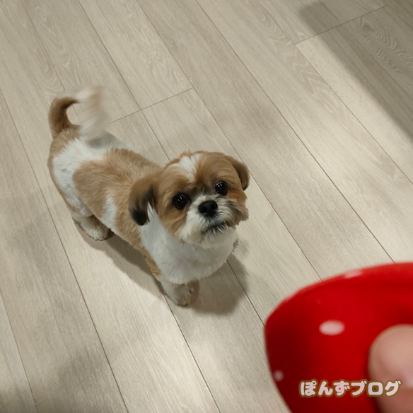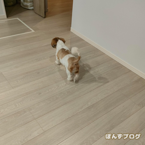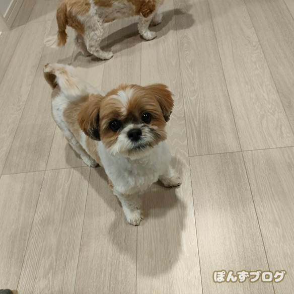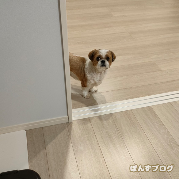 朝と違う匂いもするし何やら得体の知れない雰囲気に警戒気味の、ぽんず。