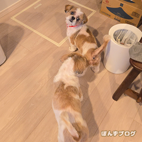 帰ってすぐ、かぼすにお尻をくんくんされています。