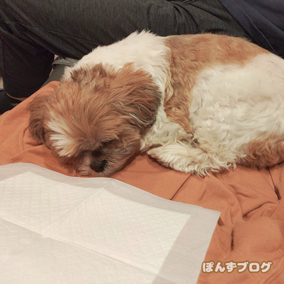 いつ吐いてしまっても良いように、トイレシーツを手の届く所に