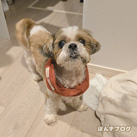 食べ残して1度寝床に帰っていった、ぽんず。