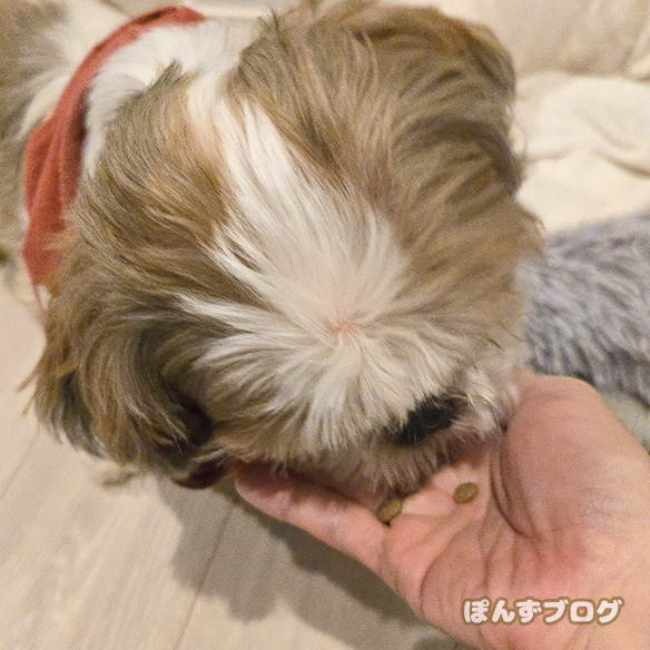 手でドッグフードをあげると
