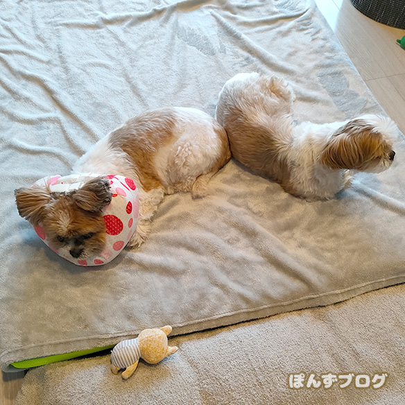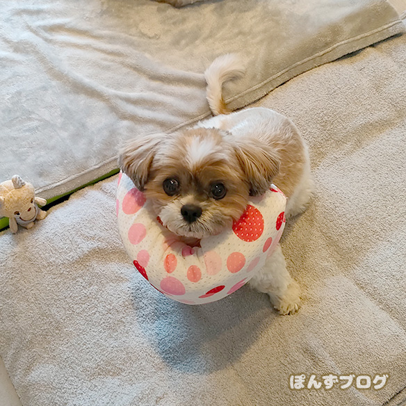 不慣れなカラーを巻かれ、固まってしまうかぼす。
