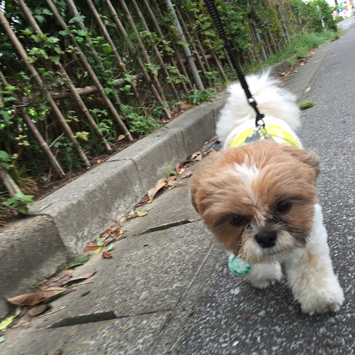 散歩開始直後の勢いはかなりのもので、まず何より先に、隣の家の犬にかぼすアタックをしかけようとします(- -;;