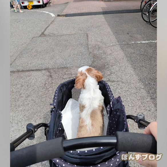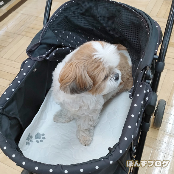 かぼすが居ないので、広々としたカートでくつろぐ、ぽんず。
