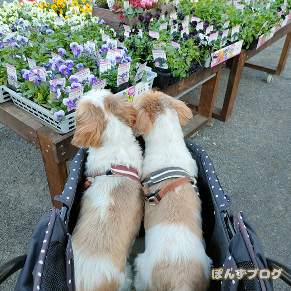 ガーデニングコーナーの店員さんを4つのまん丸い目で見つめていて、